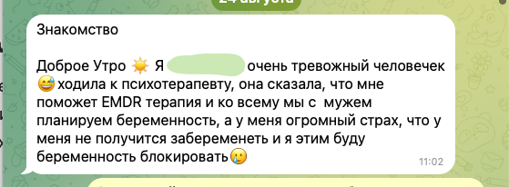 До меня, репродуктивного психолога, она дошла после рекомендаций гинеколога и психотерапевта. Так и сказали "Поможет EMDR".
