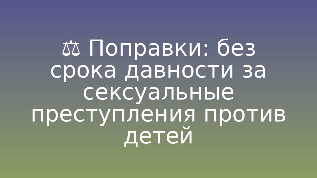 Депутаты и сенаторы предложили отменить сроки давности по делам об изнасиловании и насильственных действиях сексуального характера в отношении лиц младше 14 лет. В пояснениях отмечено, что сейчас сроки давности не применяются к преступлениям, связанным с терроризмом и совершённым против государства. Инициатива предусматривает недопустимость прекращения таких уголовных дел по истечении срока давности. В случае принятия поправки вступят в силу со дня официального опубликования.