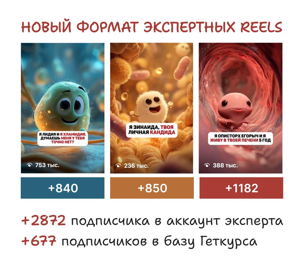 Нащупали тут интересную связку по генерации трафика из рилсов – делюсь У нас в блоге нутрициолога почти 200к подписчиков, которые были собраны чисто на экспертном контенте. Но последнее время стало всё сложнее пробиваться в рекомендации и добывать заветные регистрации. Особенно если просто смотреть в камеру и выдавать какую-то пользу. Формат начинает потихоньку умирать. Это и понятно. Человек же приходит в соцсети чтобы разгрузить голову и позалипать на чём-то интересном, а не изучать биологический состав кишечника и анализировать причино-следственную связь своих проблем со своими действиями. Значит наша задача научиться выдавать экспертный контент в залипательном формате. Что, собственно мы и сделали. 1. Наша неизменная коператрица @quillwitch наклепала нам пачку гениальных сценариев с интересными персонажами (Лидия Хламидия, Кандида Зинаида, Описторх Егорыч и т.п). Примеры готовых рилсов закину в комментарии. 2. Затем наши умелые монтажёры по моим инструкциям из Нейробазы раск
