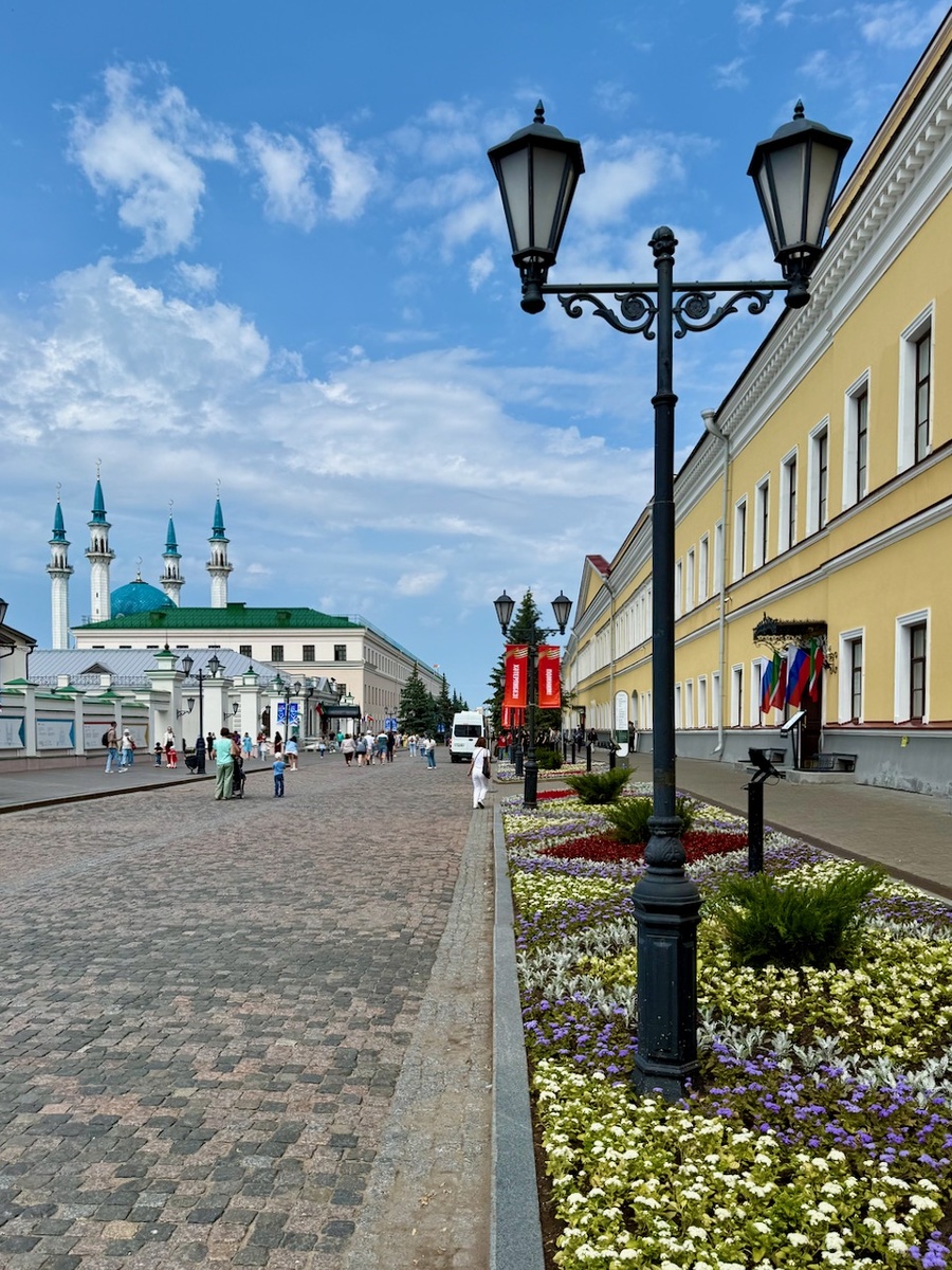 Начну издалека - как все-таки солнечная летняя погода украшает города нашей средней полосы! Казань не стала исключением - гулять в Кремле в июне было намного приятнее, чем в марте. И уж точно фотогеничнее. Нынешний Кремль в Казани был построен уже после прихода Ивана Грозного. Именно он приказал отстроить его заново, но уже не из дерева, а из белого кирпича. Поэтому первое, что встречает туриста - это белокаменные стены и башни. Изначально их было 13, сейчас осталось только 8. Понятное дело, изначально внутри Кремля были построены только православные церкви и монастыри. Изящная мечеть Кул-Шариф появилось гораздо позже, в 2005 году, на месте разрушенной в 1552 при штурме Казани. В мечеть можно зайти, внутри нее расположен музей. Православная церковь времен Ивана Грозного представлена Благовещенским собором. Его сине-золотые купола напоминают небо и солнце. А сам он выглядит монументально, но при этом нарядно что ли, если можно так выразиться. Очень привлекательное строение для туристов