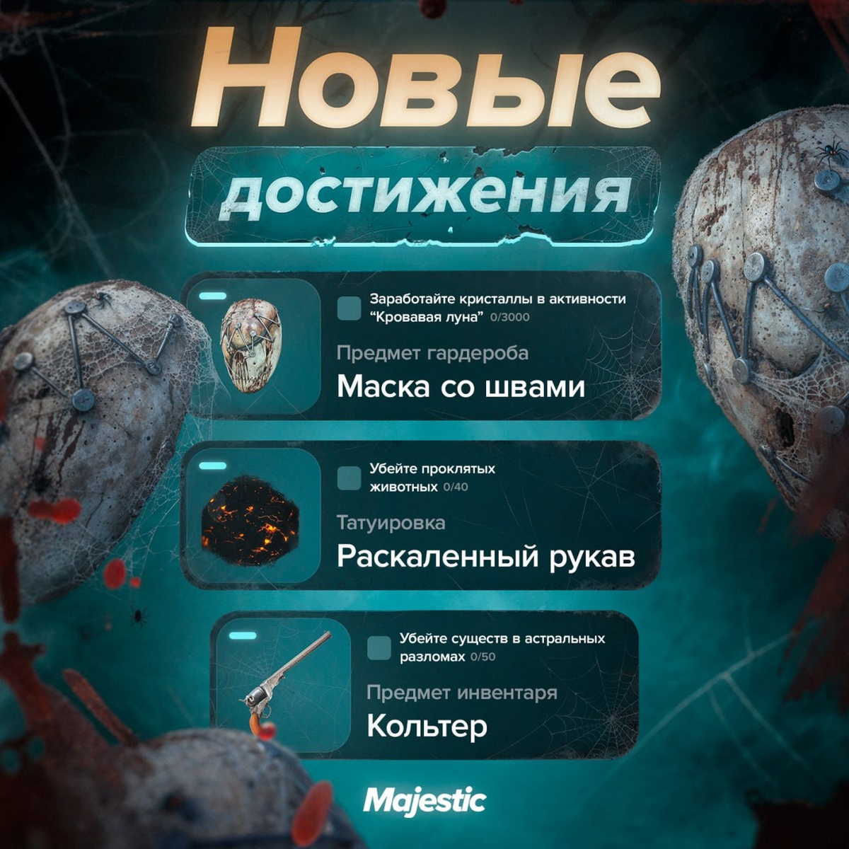 🦇 Забирай еще БОЛЬШЕ НАГРАД в этот Хэллоуин Пока магия темного сезона окутывает все вокруг, выполни три новых достижения и получи уникальные трофеи: • Маска со швами — идеально дополнит жуткий образ. • Татуировка «Раскаленный рукав» — придаст дерзости. • Пистолет «Кольтер» — удвоит кристаллы за убийства. 👻 Следи за своим прогрессом в разделе «F2 >> Задания >> Достижения» и помни — времени остается все меньше. 💀 Majestic Role Play