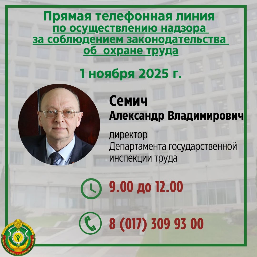 ☎️ Завтра — прямая телефонная линия по вопросу осуществления надзора за соблюдением законодательства об охране труда Завтра, 1 ноября, директор Департамента Семич Александр Владимирович проведет прямую телефонную линию 🕘 9.00 до 12.00 📞(8 017) 309 93 00