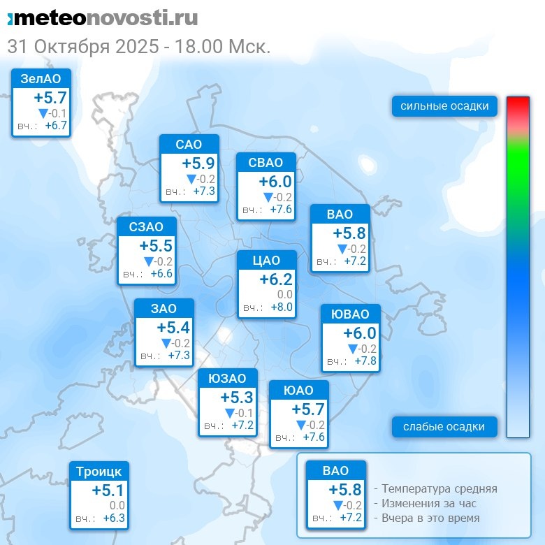 В 18:00 в Москве было от +4.7°C до +6.4°C, средняя температура +5.8°C #погода #Москва #осень #температура #31октября #пятница