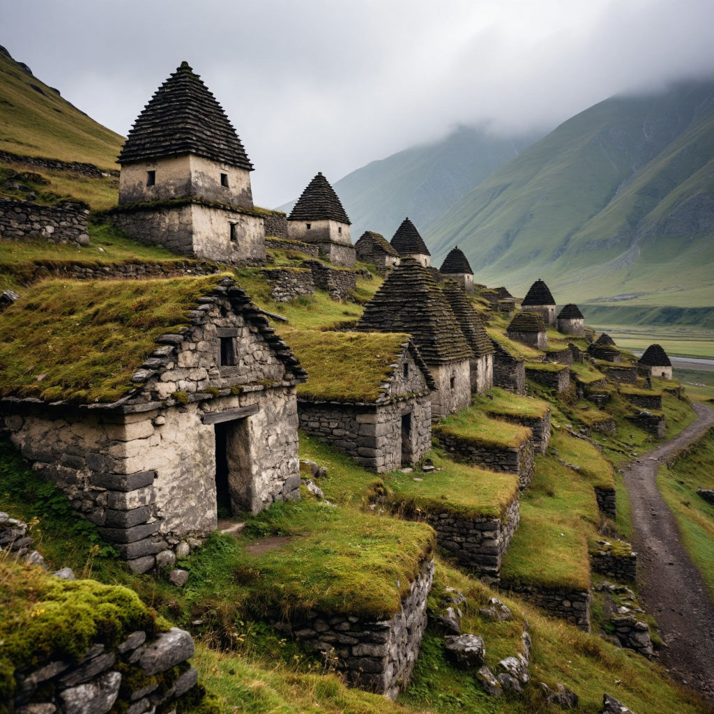 И вот перед ними открылась панорама Даргавса. Десятки каменных склепов, «кельи мёртвых», разбросанные по крутому склону, словно гигантские каменные гробы. Одни были простыми саманными сараями с остроконечными крышами, другие — двухэтажными мавзолеями с крошечными оконцами, похожими на пустые глазницы. Древесина балок почернела от времени и влаги, камни поросли густым мхом, который казался неестественно ярким, почти ядовитым в этом унылом пейзаже.