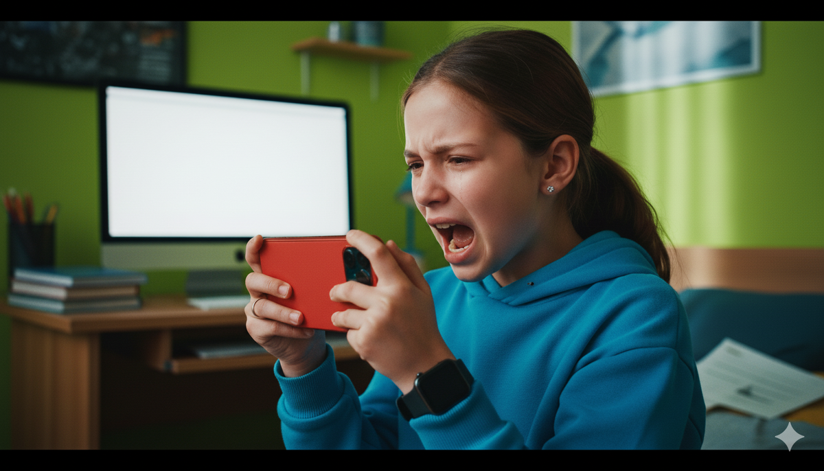 Одиннадцатилетняя девочка спит с телефоном под одеялом. На экране — заставка какой-то игры. Мать находит гаджет глубокой ночью, проверяя дочь. Выясняется: ребёнок играет не полчаса в день, как договаривались, а 5-6 часов. Обходит все родительские контроли. Утром — скандал, блокировка приложений, наказание.