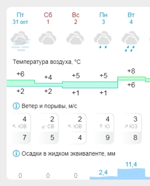 На три дня отдыха со 2 по 4 ноября погода приготовила костромичам напоминание о поздней осени. Если в первый выходной — в воскресенье 2 ноября — в прогнозе нет и намека на осадки, то в понедельник 3 ноября дождь ожидается уже вполне ощутимо. А в День народного единства 4 ноября и вовсе погода запланировала серьезный ливень на весь день. Удивительно, что температура воздуха от одного выходного дня к другому не снижается, что было бы вполне логично в начале ноября, а, напротив, даже слегка подрастет. В воскресенье и понедельник ждем до 5-6 градусов тепла днем и +1 ночью. А во вторник, в праздничный день — днем до +8 и всего на два градуса ниже ночью — до +6. Сохранит ощущение зыбкого, но все же тепла, и южный ветер, который к 4 ноября сменится на юго-восточный, но все три выходных дня не будет сильным. Кстати, практически вся первая неделя ноября обещает быть щедрой на дожди. Но подробнее мы узнаем об этом чуть позже… Фото: Гисметео, K1NEWS.RU.
