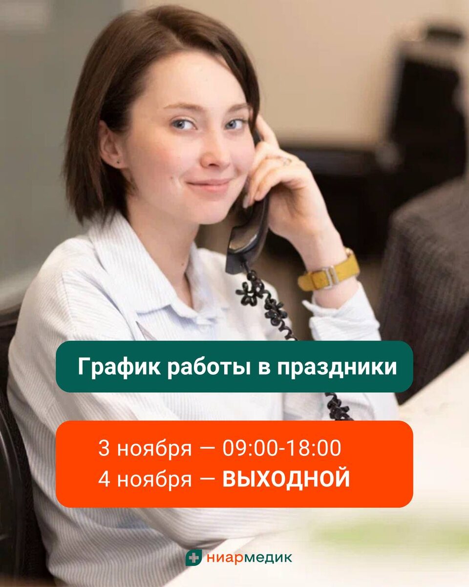 Уважаемые пациенты! 📅3 ноября сеть клиник «Ниармедик» работает с 09:00 до 18:00. 📅4 ноября — выходной день. В остальные дни наши клиники работают по обычному расписанию 😊 Планируйте визит заранее — и будьте здоровы! 🤎 Запись на приём: 📱+7 (495) 154-40-75 💻 По ссылке