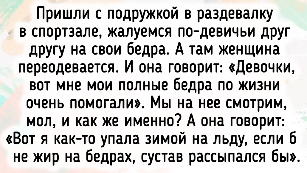 Пришли с подружкой в раздевалку в спортзале, жалуемся по-девичьи друг другу на свои бедра. А там женщина переодевается. И она говорит: «Девочки, вот мне мои полные бедра по жизни очень помогали». Мы на нее смотрим, мол, и как же именно? А она говорит: «Вот я как-то упала зимой на льду, если б не жир на бедрах, сустав рассыпался бы». © G00dM00d / Pikabu