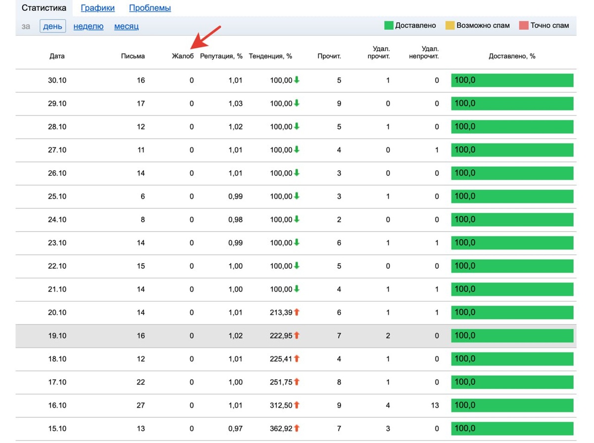 Если хотите, чтобы ваш b2b cold email outreach не попадал в СПАМ, то просто следите вот за этой колонкой. Я скрин сделал час назад по одному нашему домену. Просто мы не шлем как СПАМ вот и жалоб нет, и 100% доставляемость. Но далеко не всегда получается так, чаще не получается. Вру, это у нас вообще один раз :) - остальное в спам летит. Русский ИТ бизнес