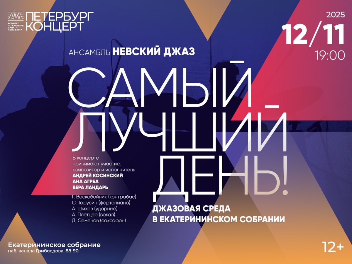 Джазовая среда в Екатерининском собрании в компании Андрея Косинского, Аны Агрба и Веры Ландарь — 12 ноября в «Петербург-концерте»! В ноябре традиционный джазовый концерт в исполнении квартета «Невский джаз» и одной из лучших джазовых вокалисток города Тони Плетцер заиграет новыми красками, ведь к артистам присоединятся Андрей Косинский, Ана Агрба и Вера Ландарь! Неизменным останется Большой зал Екатерининского собрания, который трансформируется в элегантное клубное пространство, где гости смогут приносить в зал напитки и закуски, приобретенные в театральном буфете, и слушать музыку, удобно устроившись за уютными столиками. До встречи на Джазовой среде! БИЛЕТЫ: 12.11 | 19:00 | Джазовая среда