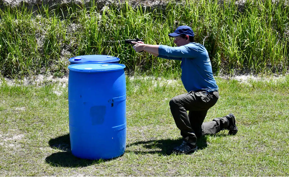 За пластиковыми бочками, имитирующими укрытие, автор приседает и производит преднамеренную перезарядку во время подготовки к оборонительной стрельбе