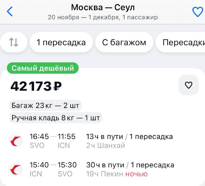 🇰🇷 Москва – Сеул (Южная Корея): осеннее путешествие от 42 173₽ Перелёт в страну утренней свежести с двумя местами багажа! Даты: 20 ноября – 1 декабря Цена: от 42 173₽ (с багажом 2×23 кг + ручная кладь 8 кг) Рейсы с пересадкой в Китае: ➜ Туда: 16:45 (Шереметьево) – 11:55 (Сеул) — Пересадка: 2 часа в Шанхае ➜ Обратно: 15:40 (Сеул) – 15:30 (Шереметьево) — Пересадка: 19 часов в Пекине (ночная) Время в пути: 13-30 часов Почему Сеул в ноябре? — Золотая осень: +5...+10°C и сухая погода — Идеально для прогулок по дворцам и паркам — Безвизовый въезд для россиян на 60 дней, но необходимо оформить разрешение на въезд KETA Важно: — В Китае транзитная виза не требуется — Длинная обратная пересадка — можно устроить мини-тур по Пекину #Сеул #ЮжнаяКорея #Осень2024 #Seoul #Korea @turmexanika