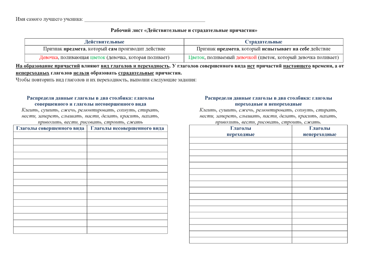 Рабочие листы по теме "Действительные и страдательные причастия" (с ответами)