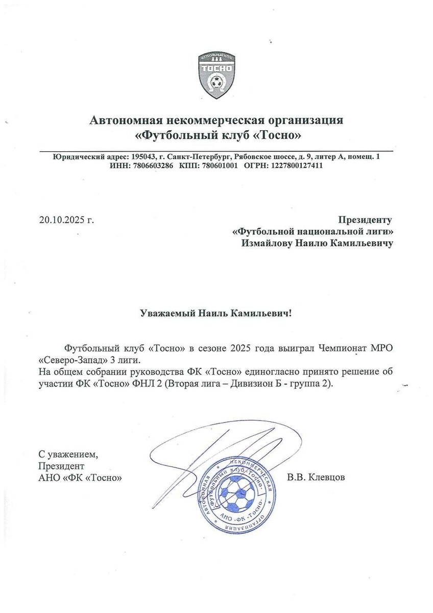 🔥«Тосно» в ФНЛ-2🔥 🇷🇺На состоявшемся общем собрании руководства ФК «Тосно» было единогласно принято решение о дальнейшем развитии клуба и участии клуба в ФНЛ-2 (Вторая Лига – Дивизион Б – группа 2)!