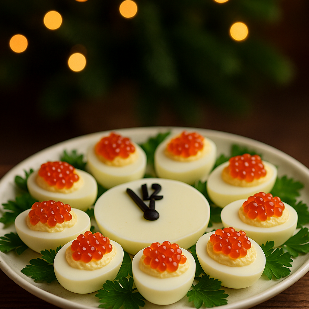 Эта закуска «Новогодние часы» — настоящий символ праздника! Она не только удивительно красивая, но и невероятно вкусная. Простые ингредиенты, знакомые всем, превращаются в эффектное украшение новогоднего стола. А самое главное — готовится быстро и без особых усилий. Ингредиенты: Яйца варёные — 5 шт Сыр твёрдый — 100 г Красная икра — 2–3 ч. ложки Майонез — 2 ст. ложки Чеснок — 1 зубчик Щепотка соли Немного зелени для украшения (По желанию: можно добавить крабовые палочки, отварную курицу или ветчину в начинку) Приготовление: 1️⃣ Аккуратно разрежь яйца пополам и вынь желтки. 2️⃣ Желтки разомни вилкой, добавь тёртый сыр, майонез и чеснок. Перемешай до однородности. 3️⃣ Наполни белки начинкой, сверху выложи немного красной икры. 4️⃣ На плоскую тарелку выложи яйца по кругу — как циферблат часов. 5️⃣ Из кусочков маслин или болгарского перца сделай стрелки, установи их на “12 без пяти” — символично и празднично! 6️⃣ Укрась зеленью и подавай к столу. Совет: если хочешь более нежный вкус —