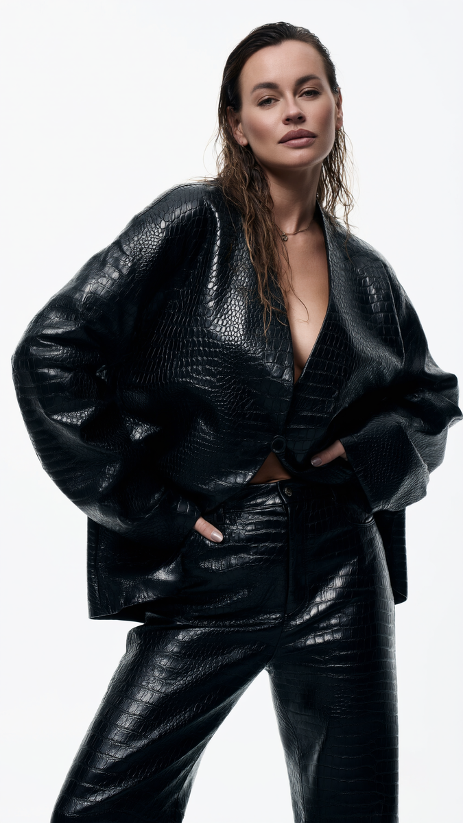 Костюм из экокожи с тиснением под кроко — вещь с характером. Он моментально делает образ собранным и редакционным, даже если на вас базовая майка и кроссовки. Главное — приручить блеск и объём: сбалансировать пропорции, выбрать правильные слои и аксессуары, а ещё — знать пару трюков по уходу. Делюсь коротким гидом на каждый день, офис и вечер. Почему это работает: Фактура добавляет глубину. Чёрный цвет в гладком исполнении может казаться плоским, а кроко‑тиснение ловит свет и делает комплект визуально дороже. Свободный крой = современный силуэт. Объёмный жакет + более собранные брюки создают «эффект силы», но при этом комфортны. Универсальность. Один костюм легко переключается между ролями за счёт обуви и слоя под жакетом. Три сценария стилизации 1) День: городской минимализм База: хлопковая майка или боди с закрытым вырезом (белый, серый меланж, графит). Обувь: лаконичные кроссовки, европейские лоферы или плоские мюли. Аксессуары: мягкая сумка‑хобо, солнечные очки прямоугольной ф