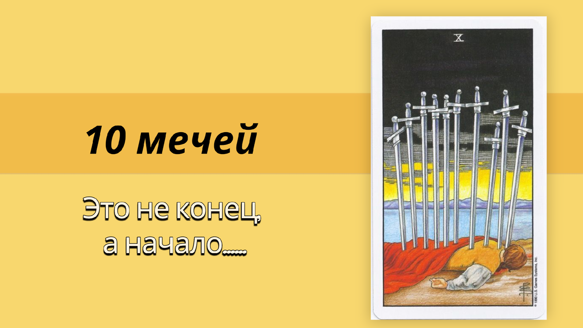 Давайте порассуждаем. 10 мечей - это в любом случае завершение того, что не могло завершиться. Дает нам наконец-то возможность вырваться, из тех оков, которые нас беспокоили в 8 мечей. Вырваться из всего, что не устраивало по жизни и наводило ужас по 9 мечей. Есть такое выражение: "Чем ярче горят мосты, тем светлее дорога впереди". Это сама суть данного аркана. Да карта не сулит нам какие-то приятности, будет реально тяжело, но наконец-то мы сможем что-то прекратить!!! Например: очень тяжелые отношения (разрыв), болезнь, тяжелое состояние. Карта говорит о том, что наконец-то все случилось. Все самое плохое случилось. Ведь если разобраться, то вряд ли этой карте предшествовала какая-то хорошая предыстория. Если пришла 10 мечей, значит в состоянии по 9 мечей вы прибывали уже очень долго, и уже даже вселенная решила: "да надо же уже, её как-то оттуда вытащить, потому что иначе она просто задохнется и умрет". И тут вселенная приходит и говорит: « НА! вам всем, умрите все и потом воскресните и будете жить дальше». Поэтому по большому счету ДА это окончание! процесса, отношений, проектов, чего угодно. Но это окончание, которое нам дает возможность выйти на новый круг. Если вы себя не добьёте, если сможете это пережить, то вас ждет новое утро. Помните что число десять как бы сливается с единицей, поэтому завершение одного этапа предполагает начало нового. Это окончательное бесповоротное завершение, и переход в новый этап. И если мы посмотрим на то, как сложены пальцы у человека на карте, то увидим знак «мудру», который очень похож на благословляющий жест нашего Иерофанта. Суть в том что, дух побеждает муки тела. Поэтому некий жест благословения «в добрый путь», у данной карты есть. Благословение чтобы отпустить старое, после чего принять новое. Какой-то сложный этап в жизни закончился и слава богу.