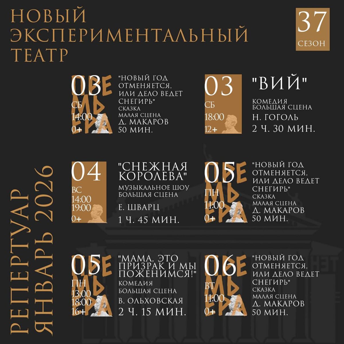 1 ноября, в 11.00, объявляется старт продаж билетов на спектакли НЭТа в январе 2026 года, и мы готовы предоставить вашему вниманию афишу, в которой найдутся спектакли на любой вкус и настроение.