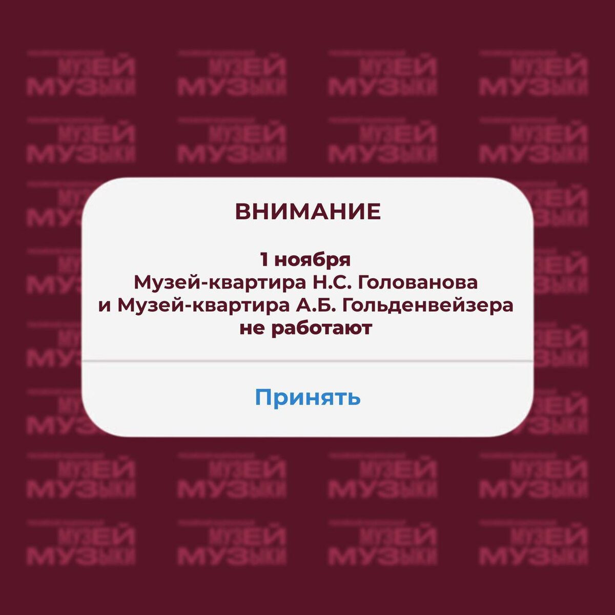 Мои дорогие, читайте внимательно: 1 ноября у нас немножко меняется расписание работы музеев! 👉 Музей музыки ждет вас с 11 утра до 8 вечера; 👉 Музей П.И.Чайковского в Москве тоже откроет свои двери с 11 до 19; 👉 Музей С.С. Прокофьева ждет гостей с 11 до 19! А вот Музеи-квартиры Н.С.Голованова и А.Б.Гольденвейзера – не работают. Знаете, как люди в музее живут – и им передышка нужна!