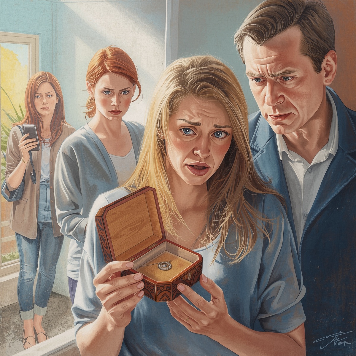Марина смотрела на неё осторожно. Внутри жужжала мысль: не спеши. Не обвиняй. Щёлкни ещё раз защёлкой — убедись, что слышишь реальность. Она взяла шкатулку и закрыла — щёлк. Простой звук. И пустой угол.