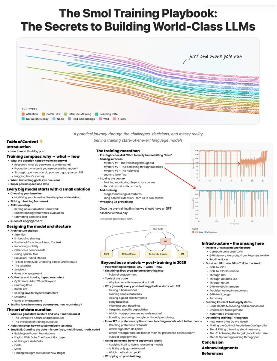 На Reddit выложили: 200 страниц секретов тренировки LLM от Hugging Face Только на r/LocalLLaMA увидел пост. Один из разработчиков Hugging Face выложил их внутренний плейбук по тренировке моделей - целых 200 страниц. Это не просто теория, а конкретный опыт их команды: что сработало, что нет, как настроить инфраструктуру. Там разобраны все этапы - предварительное обучение, дообучение, развертывание. Особенно ценно, что это не маркетинг, а реальные кейсы с проблемами и решениями. Как раз то, чего не хватает в открытых источниках. Что внутри: - Полный пайплайн тренировки моделей от начала до конца - Реальные кейсы и ошибки, которых стоит избегать - Инсайды по настройке инфраструктуры от команды HF - Конкретные рекомендации, проверенные на практике [ссылка] [ссылка на плейбук] А вы изучаете такие гайды по тренировке моделей? Или считаете, что это уже устаревает с появлением готовых решений? Или как я - просто потребляете? :) Русский ИТ бизнес