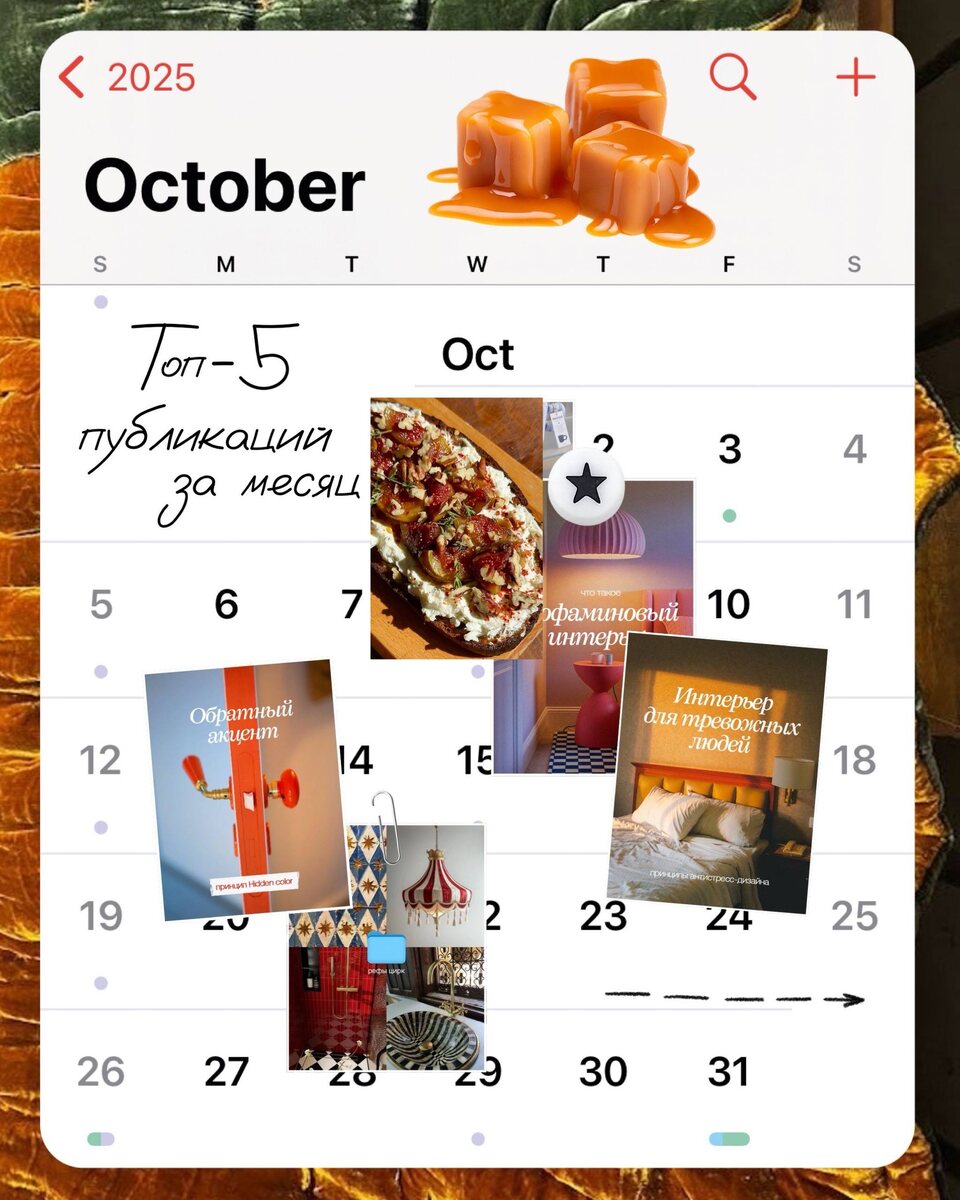 Самые популярные материалы за октябрь: • Дофаминовый интерьер - про то, как цвет, форма и хаос делают нас счастливее • Рефы цирк - вдохновляющая подборка тематики circus • Обратный акцент - принципу дизайна Hidden color наглядно • Интерьер для тревожных людей - принципы антистресс-дизайна • Рецепт инжира с бурратой 🍁