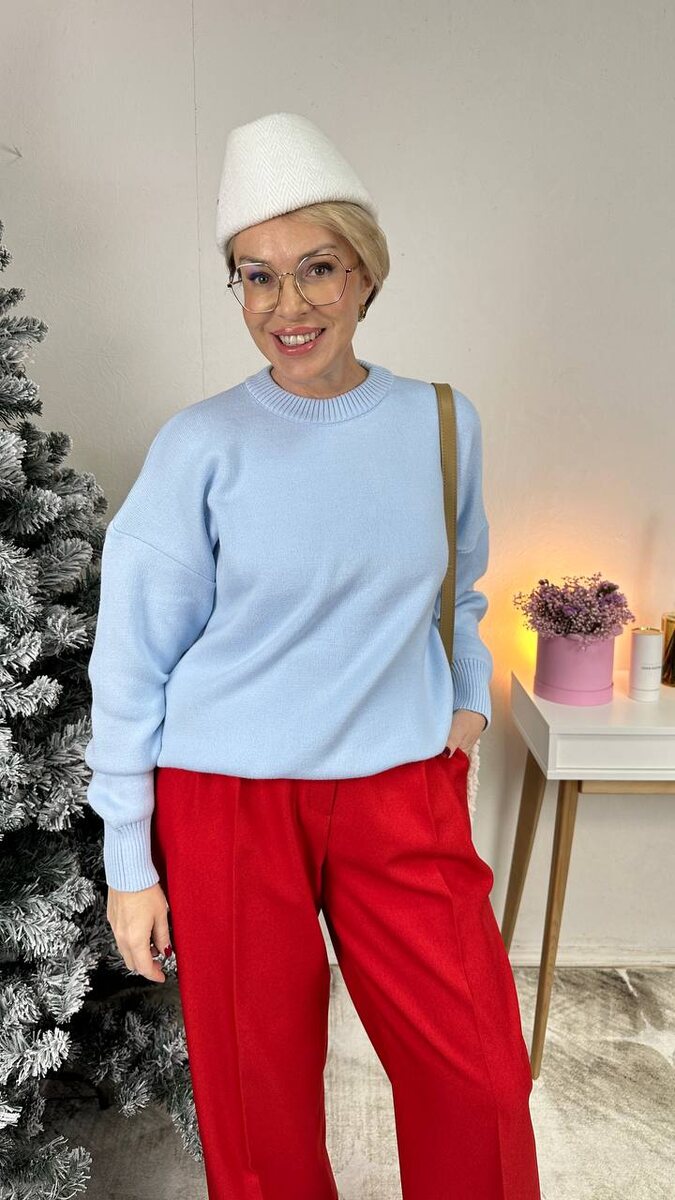 Свитер свободного кроя со спущенной линией плеча. Дизайн с классическим воротником-стойкой и резинками на рукавах и по низу изделия, в составе 50% шерсть мериноса и 50% акрил. В наличии множество цветов (как базовых, так и ярких).
