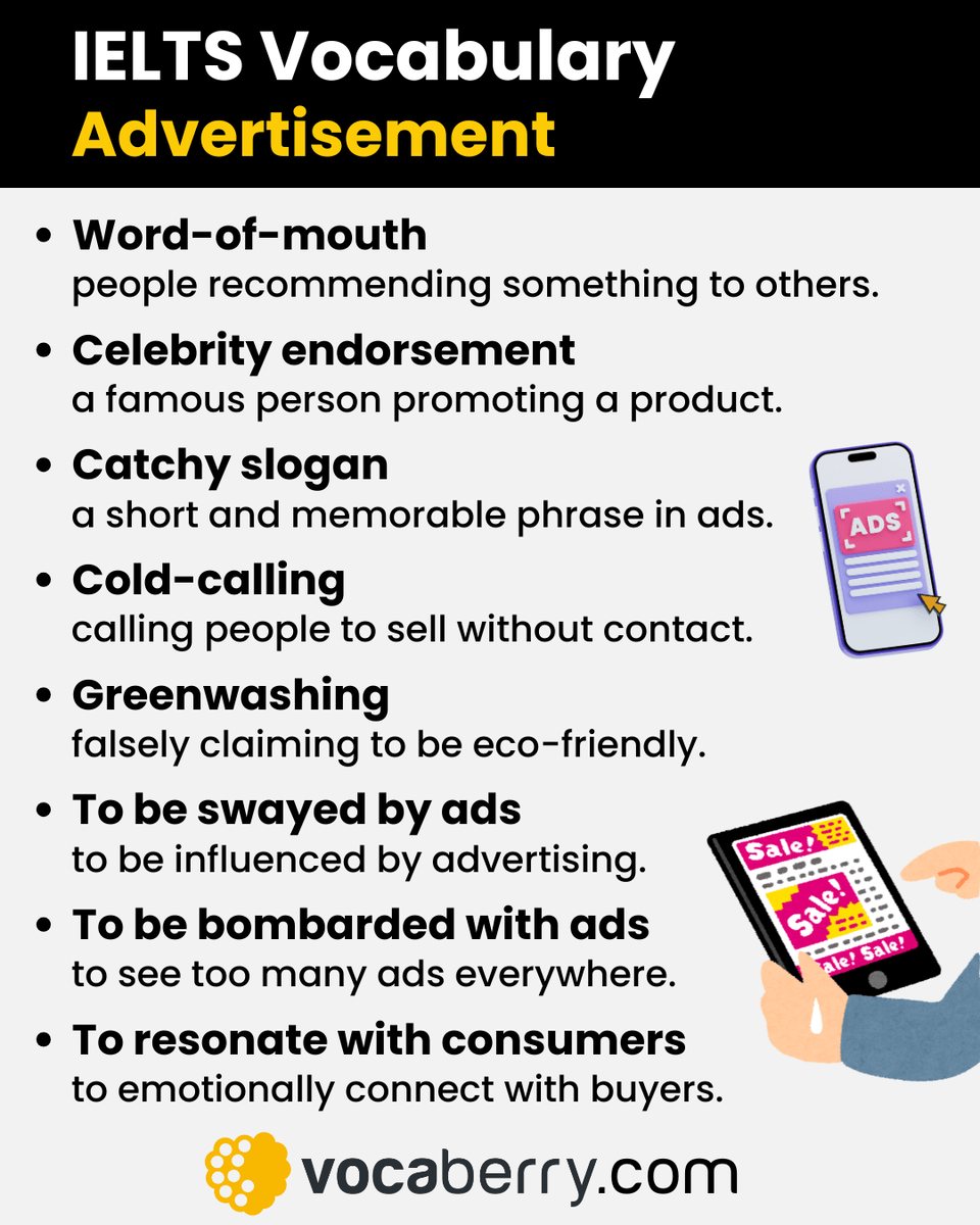 Here is some useful IELTS vocabulary for talking about advertisements with clear definitions. These words and phrases will help you give better answers in the IELTS Speaking test.