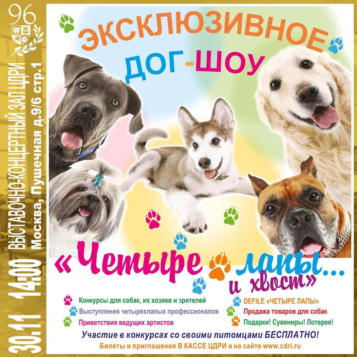 Эксклюзивное ДОГ-ШОУ «Четыре лапы и хвост» В мире миллионы людей, которые обожают собак. Конечно, как могут не вызвать умиление эти ласковые, преданные, умные и такие симпатичные животные! Ежегодная веселая программа с участием собак разных пород дог-шоу «Четыре лапы и хвост» для всех любителей собак, заводчиков, тех, кто подумывает обзавестись питомцем. Основная часть программы — конкурсы для гостей и демонстрация результатов домашней дрессуры. Принять участие в них смогут все желающие. Кроме этого, зрители увидят: краткие выступления дрессировщиков и заводчиков, номера с участием профессиональных четвероногих артистов, показ одежды для питомцев. Также будет организована продажа модных нарядов для ваших любимцев, дефиле. Любуемся, восхищаемся, умиляемся! Традиционно организаторы готовят для всех участников розыгрыши призов и лотереи. Возможно также присутствие на мероприятии ветеринарного врача. Во время проведения Дог-шоу работает магазин товаров для животных. Запись на участие по те