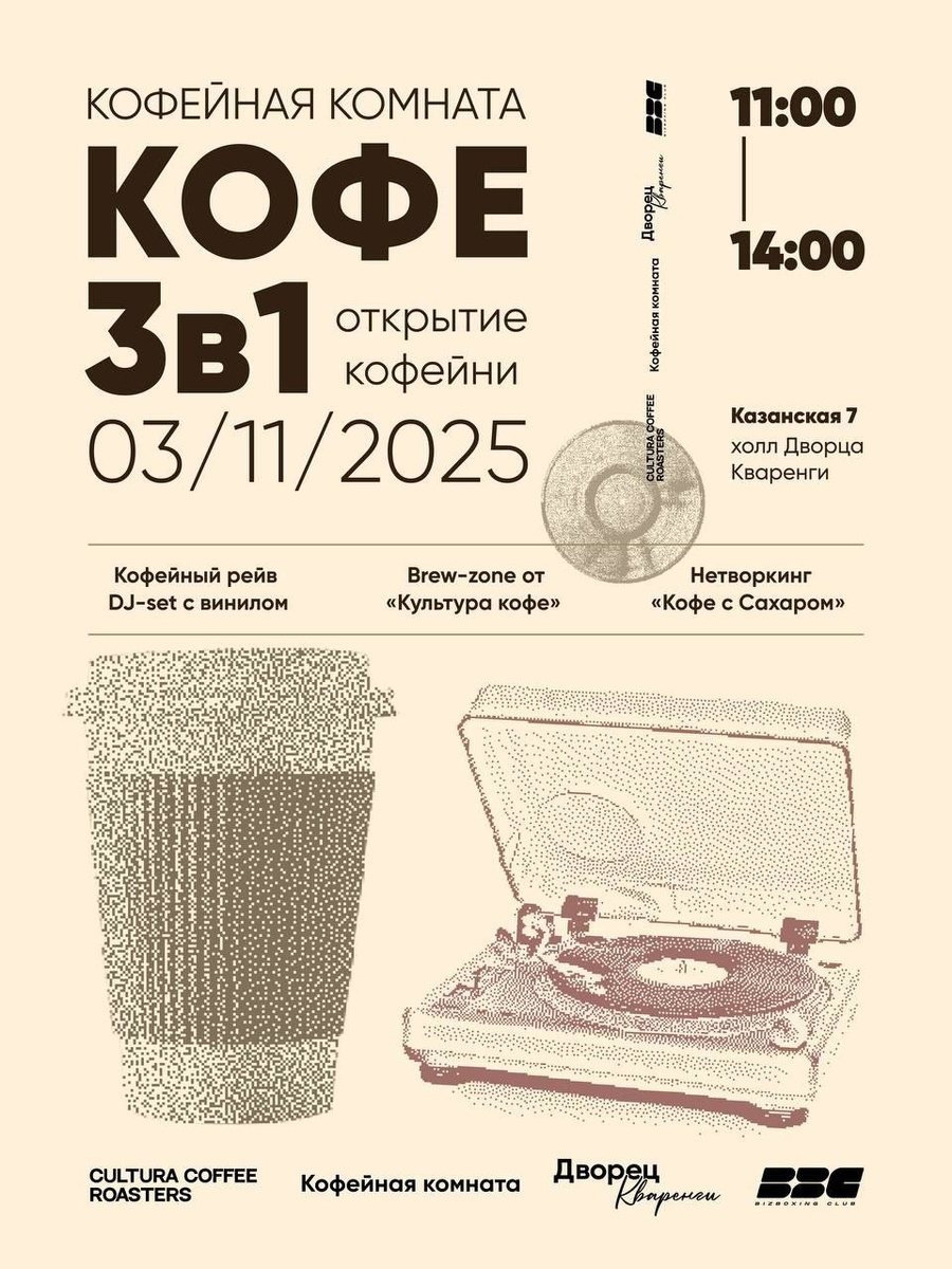 КОФЕЙНЫЙ РЕЙВ 3В1 с винилом, каппингом и нетворкингом. 🔐Во Дворце Кваренги официально открывается новая кофейня — «Кофейная комната», вдохновлённая эпохой императрицы Марии Фёдоровны, где история встречается с современностью. Программа открытия: 11:00–13:00 — кофейный рейв Виниловый DJ-сет от Юры Нестерова создаст мягкий ритм утра. Будет фотобудка и в фотозона с атмосферными цитатами и «парящими» стаканчиками. Каждый гость получит маленький подарок с тематическими стикерами. На большом рулоне бумаги можно оставить свои идеи необычных сочетаний — тех, которых ещё нет в меню, но которые точно заслуживают внимания. И, возможно, именно вы станете автором нового напитка в нашем специальном меню. 12:00–13:00 — brew-зона от «Cultura coffee» Один из лучших петербургских ростеров расскажет, как рождается вкус, покажет разные способы заваривания и проведёт серию дегустаций. Нон-стоп брю на протяжении часа — настоящий перформанс для кофеманов. 13:00–14:00 — кофейный нетворкинг с Bizboxing Clu