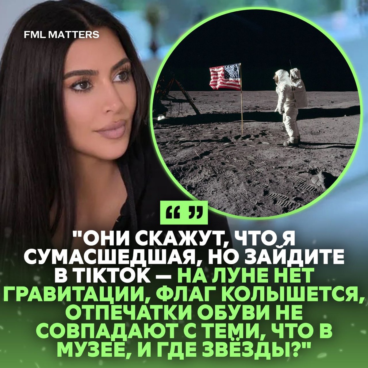 ❌ КИМ КАРДАШЬЯН НЕ ВЕРИТ, ЧТО ЛЮДИ БЫВАЛИ НА ЛУНЕ! В новом эпизоде семейного шоу Ким заявила, что не верит, что люди были на Луне: флаг колышется без гравитации, отпечатки обуви не совпадают с музейными, а на фото нет звёзд. Её мнение вписывается в популярную конспирологическую теорию — «Moon landing conspiracy», распространённую на TikTok и других платформах, где пользователи спорят, действительно ли люди побывали на Луне, или все кадры и видео были сняты на Земле с целью пропаганды космических достижений. Согласны с ней? ❤️🔥 / 👎 💀 FML MATTERS