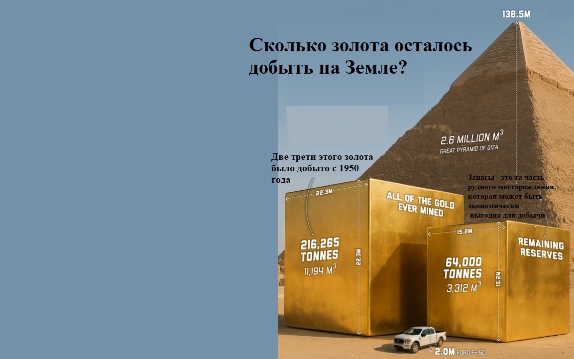 За всю историю человечества, в мире было добыто 216 тысяч тонн золота, и примерно 64 тысячи тонн запасов осталось в недрах. Если бы все когда-либо добытое золото переплавили вместе — около 216 000 тонн — получился бы куб высотой всего 22 метра, что примерно равно высоте четырехэтажного здания. Между тем, мировые разведанные и экономически извлекаемые запасы золота составляют около 64 000 тонн, что представляет собой меньший куб со стороной 15 метров. Такие данные предоставила мировая геологическая служба, в прошлом месяце, а всемирный совет по золоту утвердил представленные данные. Почти 3/4 всех известных месторождений золота уже добыты. По мере того, как новые месторождения встречаются реже, а стоимость добычи растёт, акцент всё больше смещается на переработку и совершенствование технологий извлечения. 2/3 всего когда-либо добытого золота было добыто с 1950 года благодаря технологическому прогрессу и промышленному спросу. Послевоенная эпоха ознаменовалась появлением крупных открытых