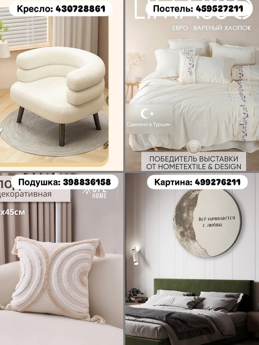 Эта подборка — готовая палитра спокойного дома: свет на разных уровнях, фактурный текстиль, мягкая геометрия мебели и нейтральные тёплые тона. Соберите собственный сценарий: кресло-объятие, круглая тумба и лампа-гриб для уголка чтения; постель из варёного хлопка с рельефной подушкой — для глубокого сна; пара текстильных панно и бра — для вечерней поэзии света.