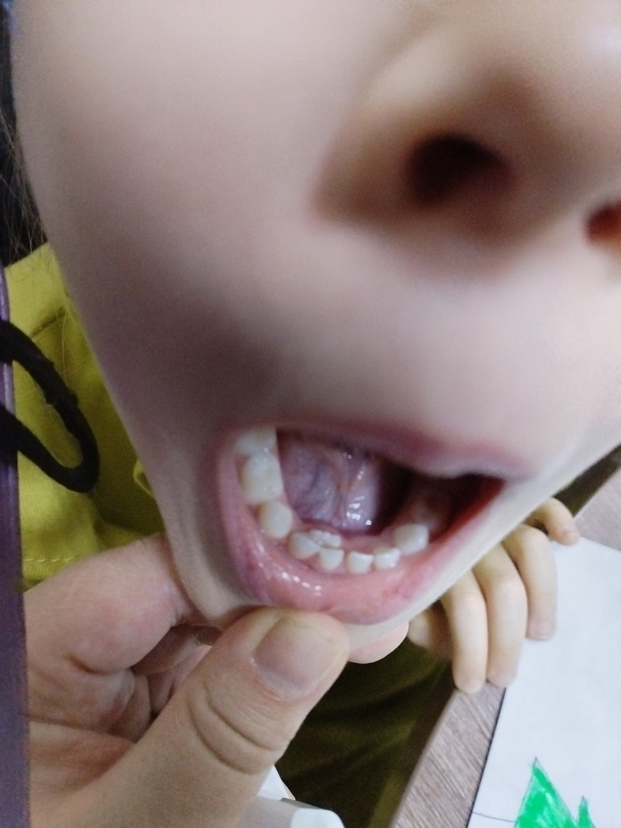 Вот так вот, вырос зуб, а никто и не заметил! И не выпал молочный! И даже не качается! Надо удалять сразу два, а фигли там, талонов нет! Похоже, что у ребенка плохая наследственность на зубы от меня - челюсть узкая, а зубы широкие. Ох, и намучаемся мы еще!