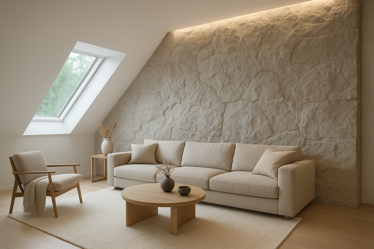 В мансарде: текстиль и дерево смягчают геометрию, а камень придает глубину. Здесь важен ритм: если скала занимает одну стену, противоположная должна быть максимально нейтральной — гладкая штукатурка или дерево без рисунка.