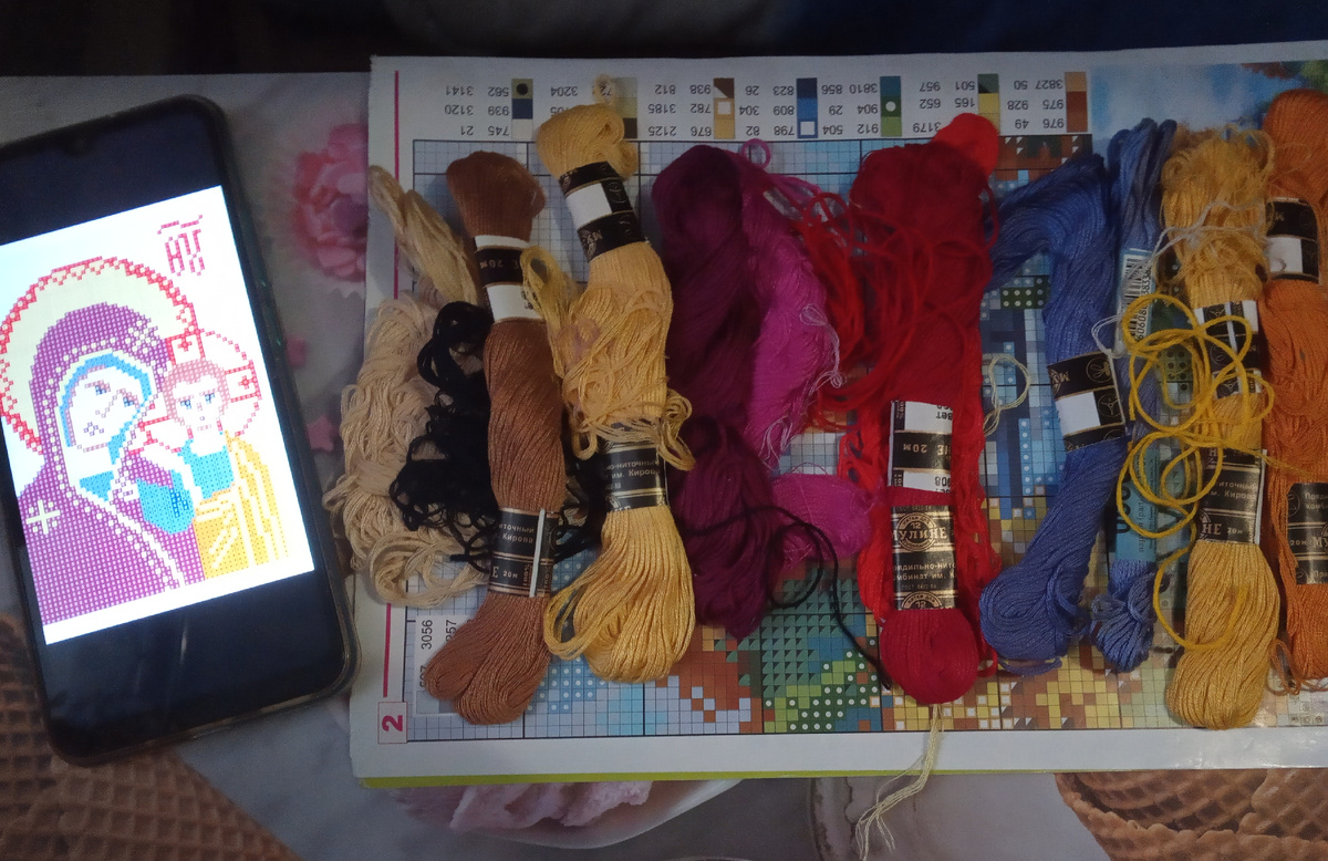 Всем здравствуйте! После долгого перерыва в занятиях вышивкой в конце сентября захотелось вышить крестиком к своему Дню рождения небольшую икону. Схему иконы Пресвятой Богородицы "Владимирская" нашла на сайте воскресной школы "Вертоградъ". Подобрала подходящие по цвету нитки мулине и приступила к делу. Схему не распечатывала, смотрела прямо с экрана смартфона. В первый день получилось вышить не очень много. Во второй день удалось продвинуться дальше, но вышиваю всего по часу-два перед сном. Это занятие хорошо помогает успокоить мысли. Душа радовалась, когда я занималась вышивкой этой небольшой иконы. Схема вышивки составлена для детей, лики Богородицы и Спасителя такие добрые! Контуры нимбов решила вышить металлизированной золотистой нитью. Работать с этой нитью непросто, но результат стоит затраченных усилий. Сначала вышила нимб Спасителя. Потом и нимб Матушки Богородицы. Работалось легко, вдохновенно, с удовольствием. От процесса вышивки получала искреннюю радость. Схема несложная, с