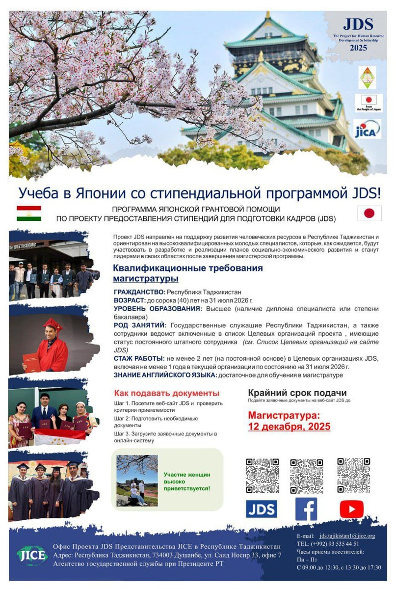 Открыт приём заявок на стипендиальную программу для обучения в вузах Японии Проект по предоставлению стипендий для подготовки кадров (JDS) в Таджикистане объявил начало приёма заявок по программе магистратуры. Кто может подать заявку? Государственные служащие и сотрудники ведомств, включенных в список Целевых организаций проекта (доступен на сайте JDS). Что предоставляет стипендия? - Полное покрытие стоимости обучения - Ежемесячная стипендия - Авиабилеты в оба конца - Поддержка на протяжении всего обучения в Японии Более подробная информация и подача заявок здесь ⬅️ Период подачи заявок: с 27 октября по 12 декабря 2025 года