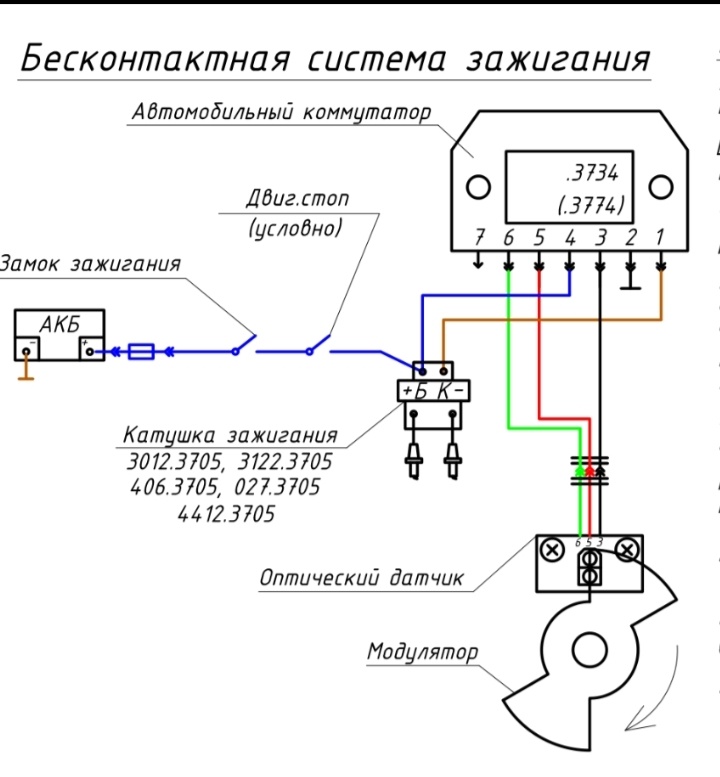 На первый взгляд очень сложно понять что делать с этими проводами, коммутатором, и датчиком. Но, если внимательно почитать и вникнуть в эту так называемую систему, настроить "БСЗ" не составит труда. Установка: 1. От оптического датчика "Хола" идут три провода красный, черный, зелёный. Их подключаем к остальной проводки зажигания по цвету. 2. Коммутатор установить в бардачок или по сиденье мотоцикла. 3. Присоединяем проводку к коммутатору. 4. Прикручиваем кронштейн датчика к генератору. 5. Прикрепляем модулятор к эксцентрику и затягиваем болтом крепления эксцентрика. 6. Клемма черного провода идет на массу, клемма коричневого на катушку зажигания. Настройка: 7. Между модулятором и датчиком "Хола" должно быть расстояние 1,5мм. 8. Угол опережения зажигания 3.5мм. До верхней мертвой точки. Внимание: Датчик работает только в темноте если при закрытии крыши генератора нечего не работает, рекомендуется закрасить её изнутри черной краской!!!