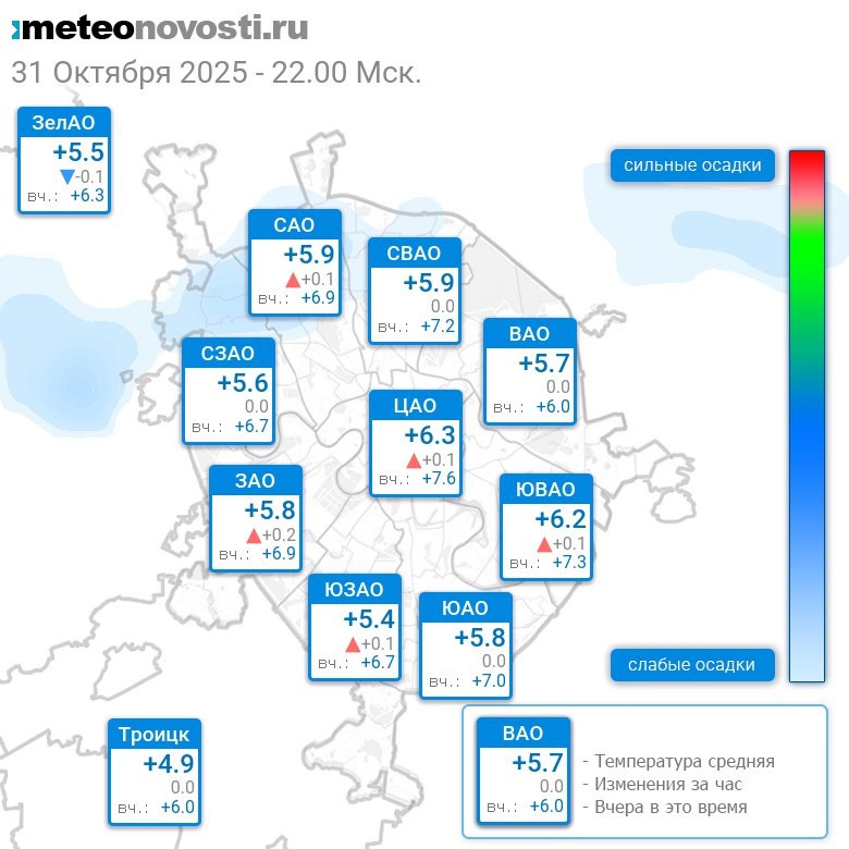 В 22:00 в Москве было от +4.8°C до +6.6°C, средняя температура +5.8°C #погода #Москва #осень #температура #31октября #пятница Перейти на сайт Прогноз погоды на 14 дней
