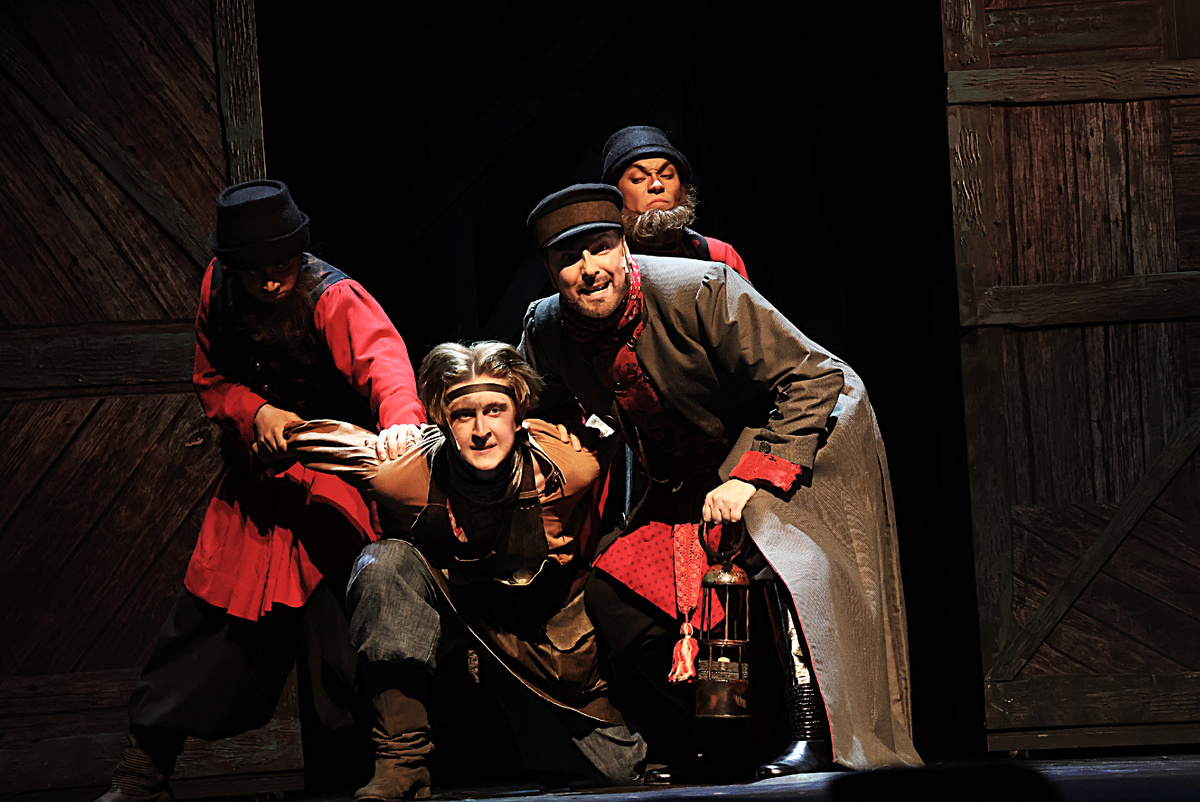 Сочный, колоритный оркестр Кондратьева (композитор, как в старые добрые времена, сам ведет спектакль) включает сочетание, казалось бы, не сочетаемого – домры, гобоя и флейты, саксофона, бас-гитары и бас-кларнета, гитар разных мастей, клавиш и самых разных ударных инструментов. Есть в его звучании и фольклорная свежесть, и жесткость современности. Великолепна работа хорового вокального ансамбля, исполняющего свои номера точно и артикулировано, а при этом еще и блестяще справляющегося с мудреными пластическими задачами, перестроениями и почти акробатическими трюками.