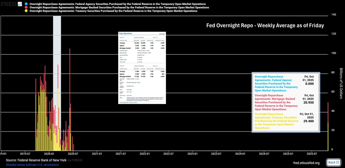 Текущий уровень в ~$50 млрд — рекордный с 2020 года, указывает на повышенный спрос банковского сектора на ликвидность от ФРС через временные операции на открытом рынке
