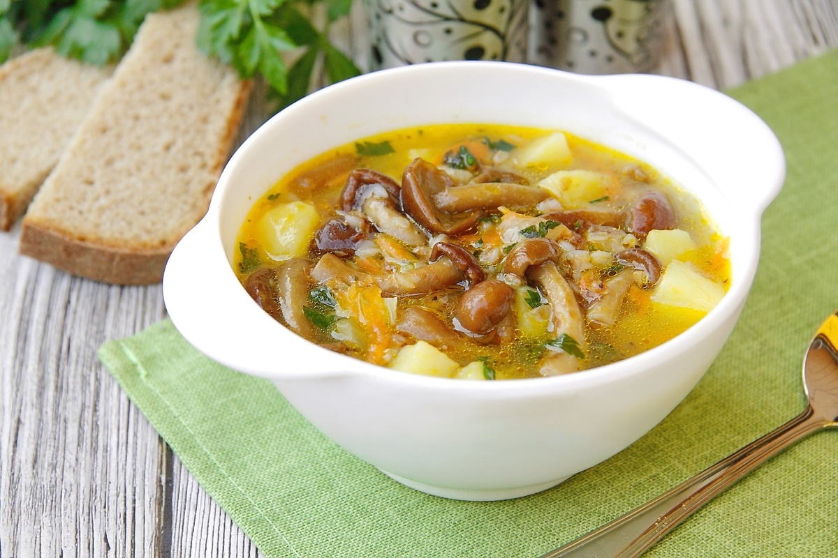Этот вариант супа в нашей семье один из любимых, с удовольствием его едят даже дети. Грибы для этого рецепта можно взять абсолютно любые, какие есть в наличии, причем подойдут как свежие, так и замороженные. Я предлагаю приготовить суп с опятами. Готовить можно как на воде (прекрасный постный вариант), так и на любом мясном бульоне. Вкусно, полезно и питательно! Читайте рецепт! Состав / Ингредиенты: