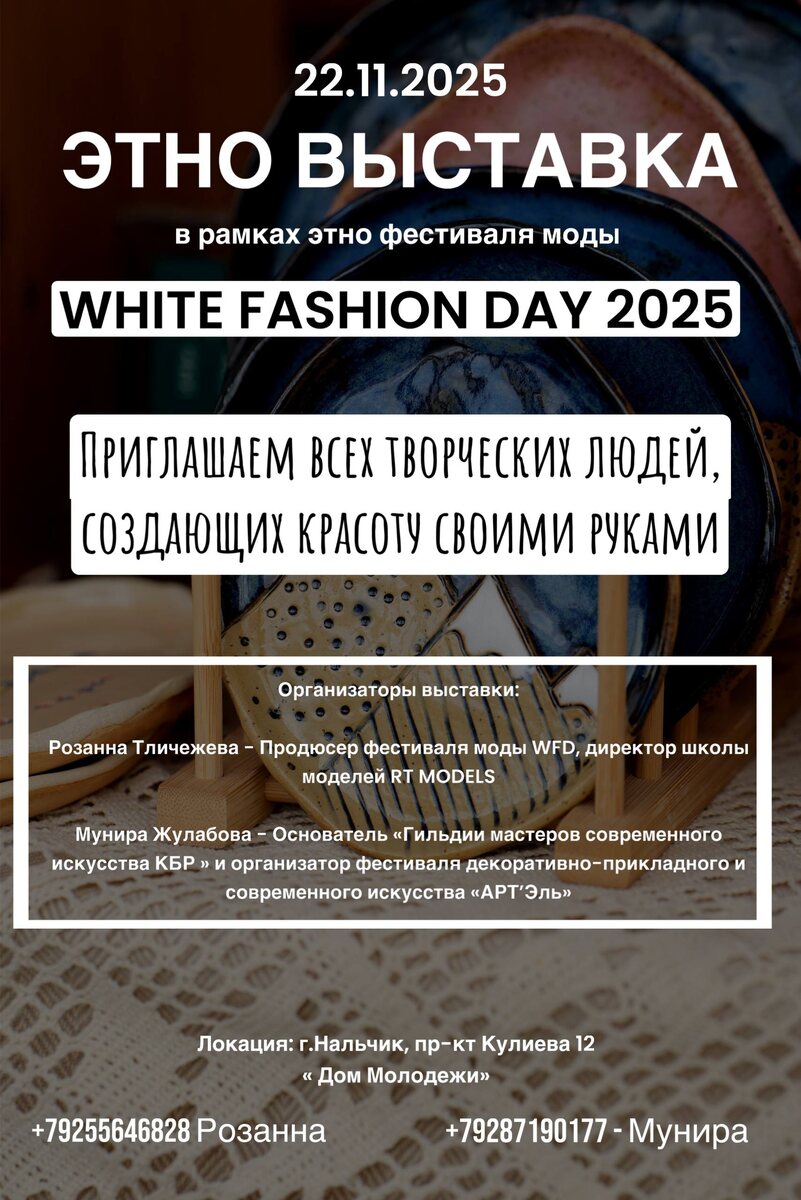 Приглашение к участию в этно‑выставке в рамках фестиваля White Fashion Day 2025 Дорогие мастера, дизайнеры и творцы! Мы команда RT Models, RT FASHION DAY , совместно с основателем «Гильдии мастеров современного искусства КБР » и организатором фестиваля декоративно-прикладного и современного искусства «АРТ’Эль» Мунирой Жулабовой, рады пригласить вас принять участие в этно‑выставке в рамках масштабного фестиваля White Fashion Day 2025! Это уникальная возможность представить свои работы в этно‑стиле широкой аудитории и заявить о себе в мире современной моды. Что вас ждёт: • площадка для демонстрации авторских коллекций и изделий в этно‑стилистике; • внимание профессионалов индустрии и потенциальных партнёров; • обмен опытом с единомышленниками; • атмосфера творчества и культурного диалога. Основные сведения о мероприятии: • Событие: этно‑выставка в рамках White Fashion Day 2025. • Дата: 22.11.2025 • Место: Дом молодёжи (г. Нальчик, проспект Кулиева, 12). • Формат: выставочное представле