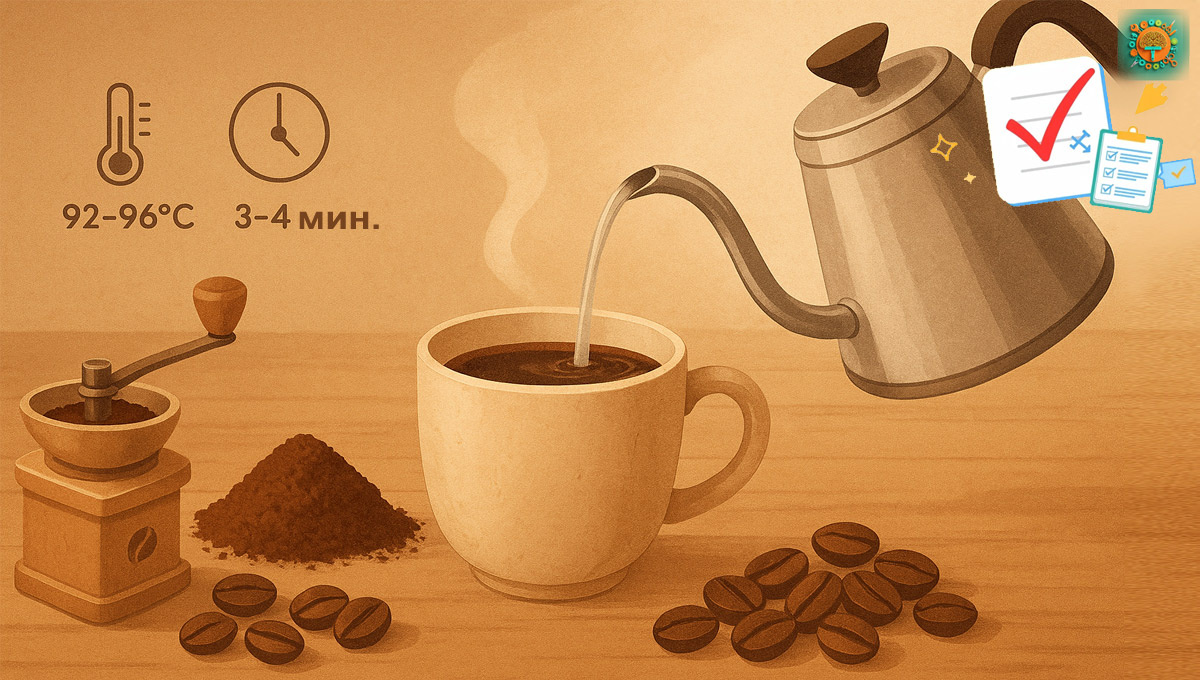 Наслаждение кофе начинается с правильного приготовления. Эти шаги помогут раскрыть весь вкусовой потенциал зерен и превратить обычную процедуру в ежедневный ритуал. ✅ Выбери свежеобжаренные зерна и храни их в темноте ✅ Измельчи зерна непосредственно перед завариванием ✅ Используй фильтрованную воду температурой 92-96°C ✅ Соблюдай пропорции: 10 г кофе на 180 мл воды ✅ Предварительно прогревай посуду для стабильной температуры ✅ Контролируй время экстракции — 3-4 минуты для ручных методов ✅ Промывай оборудование сразу после использования Попробуй сегодня изменить помол — это самый простой способ повлиять на вкус готового напитка! ☀️ Для создания правильного утреннего настроения дополни кофе ритуалами из нашего чек-листа «Идеальное утро за 30 минут». ☀️