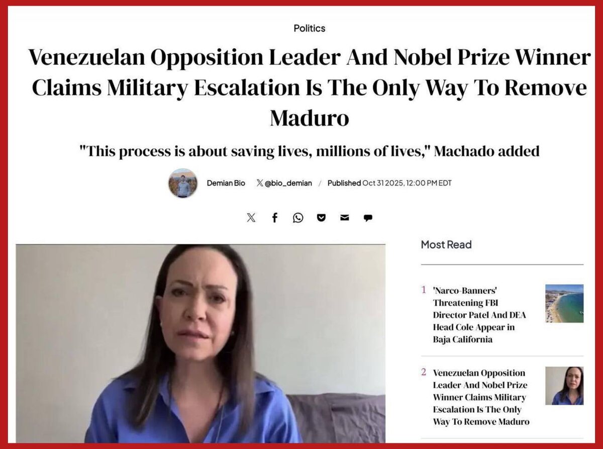 Мария Мачадо, которая в этом году увела Нобелевскую премию мира из-под носа Трампа призывает американцев напасть на её родную страну - Венесуэлу. Это все, что нужно знать о Нобелевской премии мира. Хотя для русских с этой премией стало всё понятно уже после того, как ее вручили Горбачеву. Подпишись на Телеграм Александр Семченко