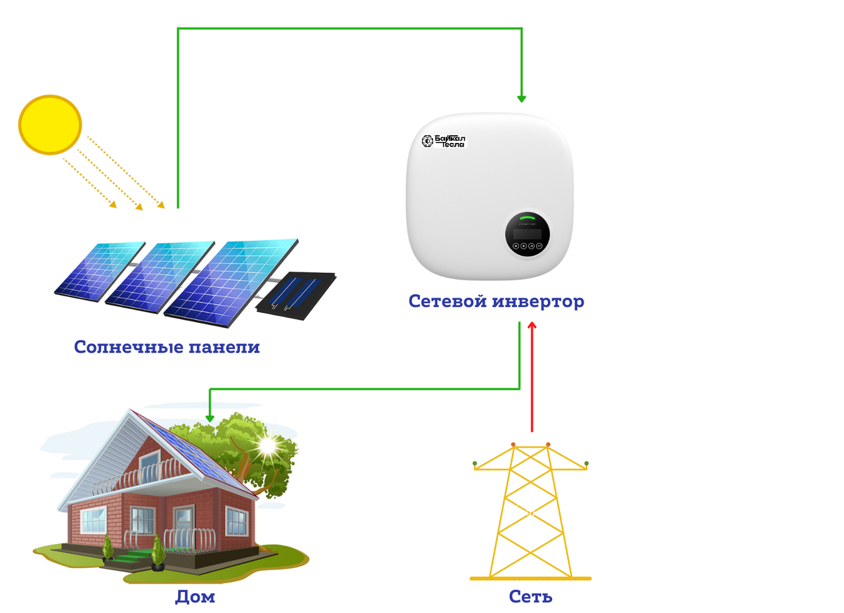 2. Инвертор преобразует его в переменный, синхронизированный с сетью.