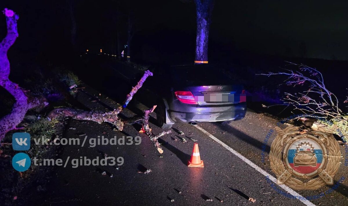 31.10.2025 в 00:14 на 45 км автодороги«Зеленоградск-Приморск» через Светлогорск, 36-летний водитель транспортного средства марки «Мерседес», двигаясь со стороны п. Красноторовка, Зеленоградского района, допустила наезд на внезапное возникшее препятствие (дерево).