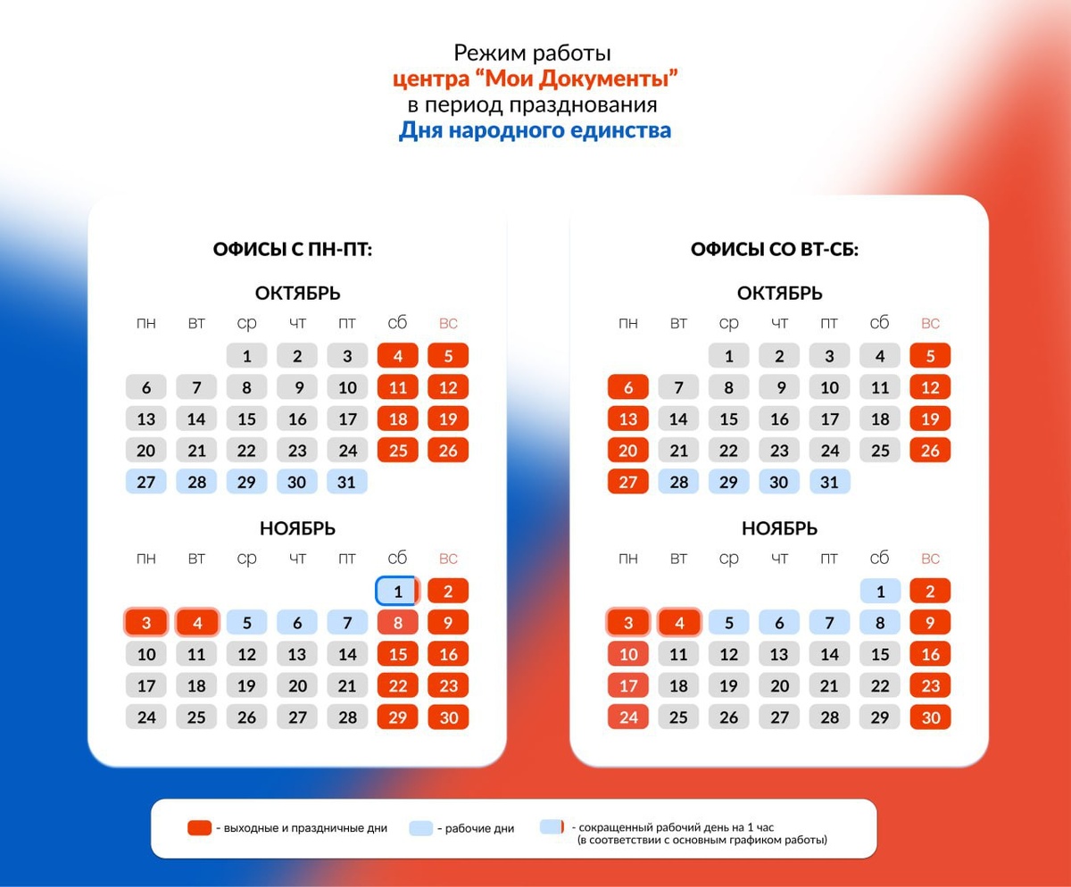 Друзья! Напоминаем об изменении графика работы офисов центра «Мои Документы» в период празднования Дня народного единства