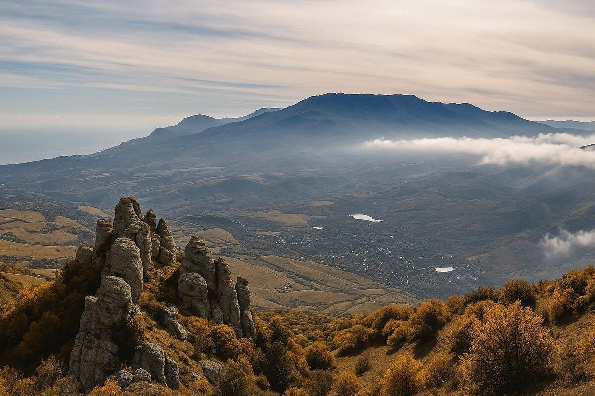 Представьте себе: вы мчитесь на комфортном троллейбусе или такси по горно-троллейбусной трассе, минуя живописное село Перевальное. Прохладный воздух долины реки Ангары обвевает вас, а вокруг – буйная растительность: дубравы, тенистые буки, заросли орешника, кизила и боярышника. Трасса неуклонно поднимается вверх, справа возвышается величественный Чатыр-Даг со своими отвесными скалами. Выше поднимаетесь – свежее становится воздух. Вскоре троллейбус преодолевает Ангарский перевал, оставляя позади северный склон горного хребта. И вот, неожиданно перед вами открывается лазурная даль – Черное море! Оно будто расстилается голубым ковром на горизонте. Троллейбус делает поворот, еще один, и вы уже видите, как солнце играет на волнах, бросая ослепительные блики. Слева от трассы вздымаются утесы Демерджи, словно цари над хаосом нагроможденных скал. Причудливые каменные изваяния в сумерках кажутся привидениями, и поэтому склон Демерджи получил название «Долины привидений». Венчающая гору скала