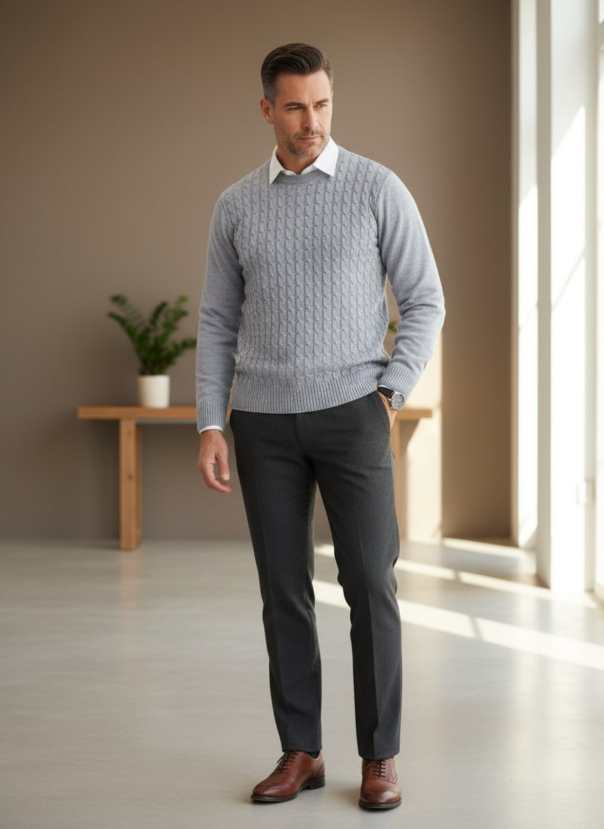 На примере двух базовых моделей: серого фактурного и белого с геометрическим узором — покажу, как легко обновить мужской стиль без шопинга на ползарплаты. Этот свитер уже сам по себе выглядит дорого — играет текстура и аккуратный крой. Добавьте классические брюки, белую рубашку и кожаные мокасины — и он готов к офисному формату или вечернему ужину.